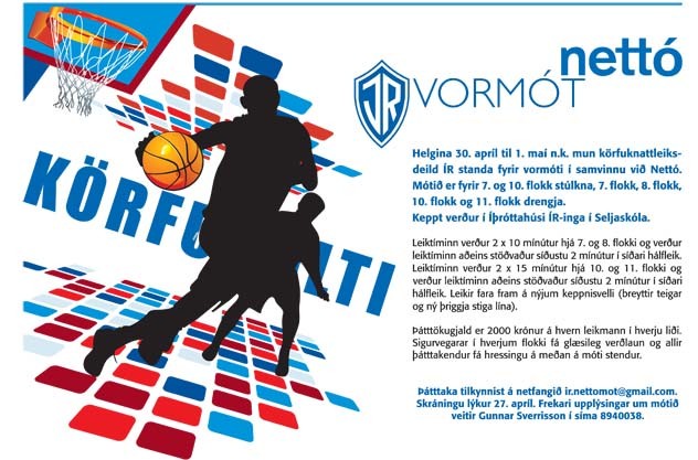 Helgina 30. apríl – 1. maí mun körfuknattleiksdeild ÍR standa að vormóti í samvinnu við Nettó. Mótið er fyrir 7. og 10. flokk stúlkna og 7.flokk, 8. flokk, 10. flokk og 11. flokk drengja. Mótið fer fram í Seljaskóla.