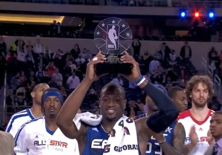 Dwayne Wade leiddi lið Austurdeildarinnar til sigurs gegn Vestrinu, 141-139, í hinum árlega Stjörnuleik NBA sem fór fram í Dallas í nótt. Þetta var sögulegur leikur þar sem rúmlega 108.000 manns mættu í Cowboys Stadium, en aldrei hafa fleiri mætt á körfuboltaleik.